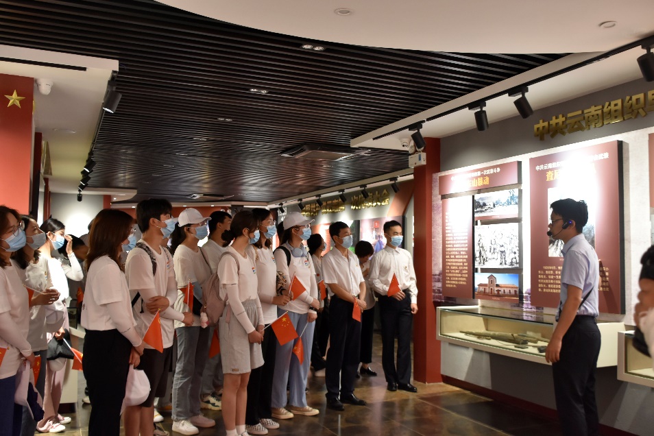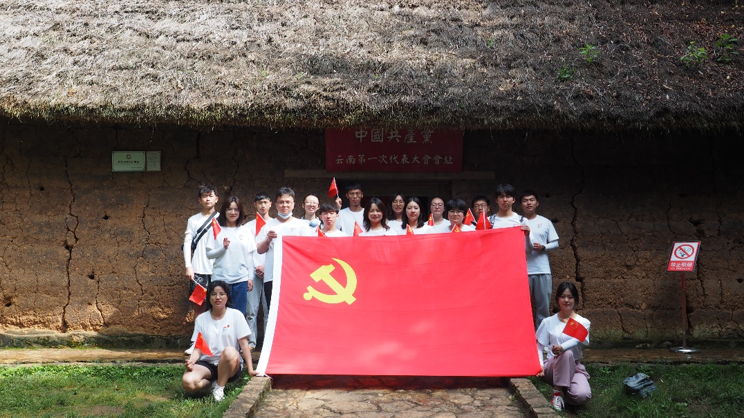 在中国共产党云南第一次代表大会会址前,实践团队党员队员在面对鲜红的党旗,重温了入党誓词,用铮铮誓言砥砺初心使命,坚定党员队员们的党性和理想信念。