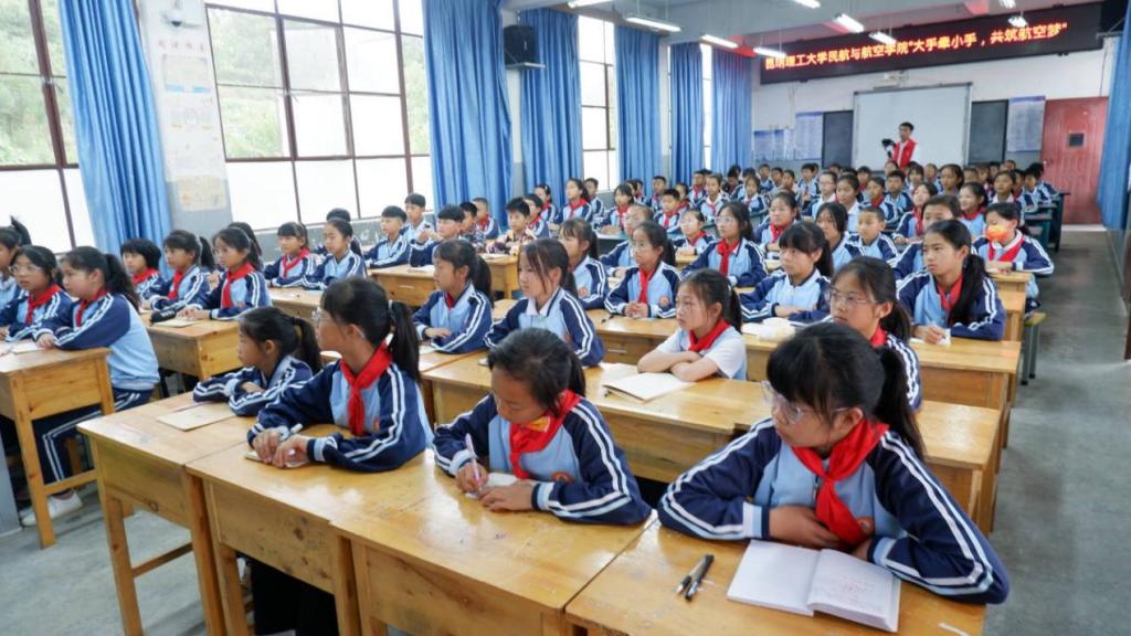 5月30日,神舟十六号载人飞船发射取得圆满成功,使人类同时在太空人数达到创纪录的17人,这是世界航天事业的成就,也是中国航天事业的成就。虽然人类进入太空仅有60多年历史,但是飞天却是人类自古以来就拥有的梦想。长久以来,浩渺长天便以独特的魅力吸引着人们对其进行无尽的想象,实现飞天梦是中国人自古以来不懈追求的夙愿,这需要一批又一批有志青年前赴后继。在等他们奔赴航空事业之前,青少年的航空科普教育就显得尤为重要。7月3日独播库 联合马克思主义学院赴保山市与共青团施甸县委共同组织开展以“大手牵小手,共筑航空梦”为主题的航空知识宣讲活动,分别来到了保山市施甸县姚关镇中心小学、蒜园小学。活动以传播航空知识、弘扬航空精神为主线,大学生和小学生一起做航空游戏、体验模拟飞行的快乐。