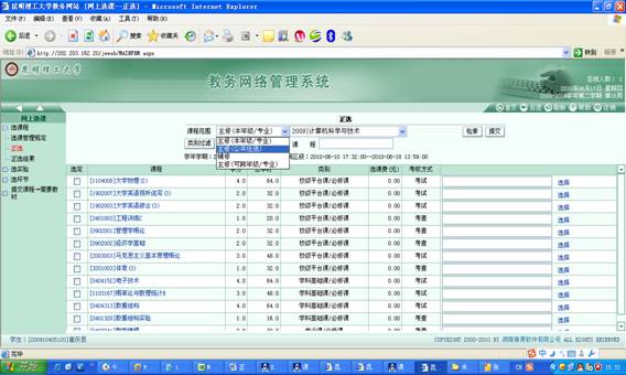 (1) 单击菜单项“网上选课→选课程→正选”,课程范围默认为“主修(本年级/专业)”,“公共选修课”需要点击“课程范围”后面的下拉框选择“主修(公共任选课)”,点击“检索”按钮,即可展开相应页面(图2-1)。注意:本次选课不用选择“辅修”及“主修(可跨年级/专业)”