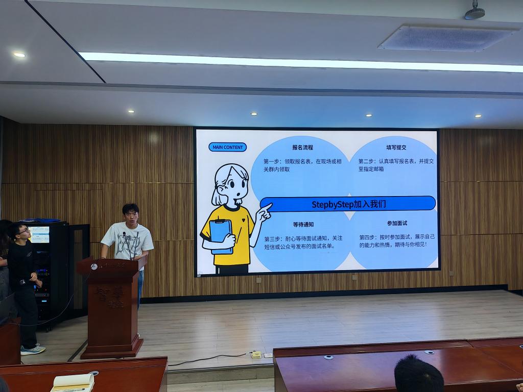 随后,招新宣讲正式拉开帷幕。团委、学生会、青年志愿者协会、飞行器爱好者协会、学生科技协会等社团代表依次上台,各展风采。为了能让新生们更清晰、全面地了解各部门职责,从而挑选出最适合自己的部门参与服务,各社团各部门都精心准备了精美的PPT。团委以图文并茂的形式展示了组织架构与思想引领成果;学生会通过动态图表呈现各部门分工与过往活动成效;青年志愿者协会用温暖的照片和感人的故事讲述公益服务的意义;飞行器爱好者协会借助模型图片与原理动画介绍专业活动;学生科技协会则以科技作品视频与研发流程展示创新魅力。新生们听得全神贯注,不时提问交流,现场气氛热烈非凡。
