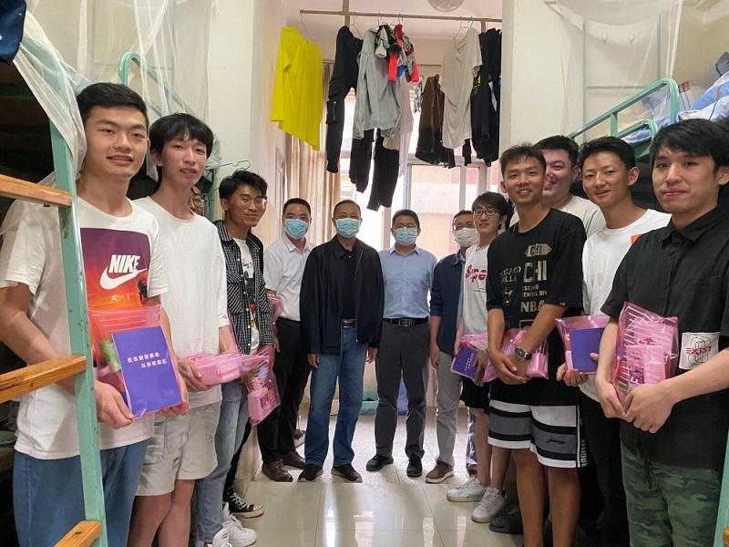 新学期开学,独播库 党委书记赵耕、院长吴建德、副书记周业林、副院长黄国勇以及辅导员深入学生宿舍自习室看望慰问学生,并向同学们送去学院的问候和防疫健康包。