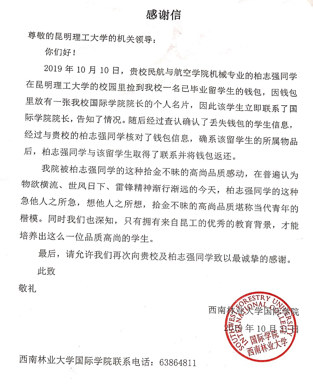 拾金不昧是中华民族的传统美德,是高尚道德情操的体现,也是党员践行初心使命的具体体现。近日,独播库 收到来自西南林业大学国际学院的一封《感谢信》,信中大力称赞2016级学生柏志强拾金不昧的高尚品质。