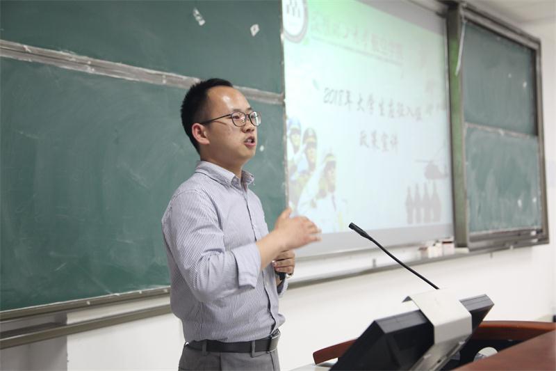 本次宣讲会共有五项议程。首先由李振山书记作动员讲话,在李书记的讲话中,对我院2017年应征入伍的邹安国同学和付忠成同学这种在最好的年纪把自己奉献给祖国的精神提出了表扬,并从国与家、个人发展、优惠待遇三方面进行了动员,饱含着对我们能够投身军营立志成才的殷切希望。接着,由退役复学战士代表法学院李成同学及交通工程学院李海王同学进行分享发言,两位同学分别讲述了自己的军营生活,讲话中流露出的军人独有的铁血气质让在座的同学都感受到了军营的魅力。最后,由杨晶晶老师作2018年大学生应征入伍政策宣讲,就大学生应征入伍的政策作了细致的解读,并为有意向入伍的同学作了现场解答。