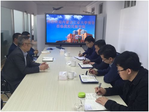 孙志强院长首先对民航学院飞行技术专业申报获批表示祝贺,并详细介绍了内蒙古工业大学基本情况和航空学院筹建、招生及办学情况,希望加深和扩大与民航学院的交流合作。