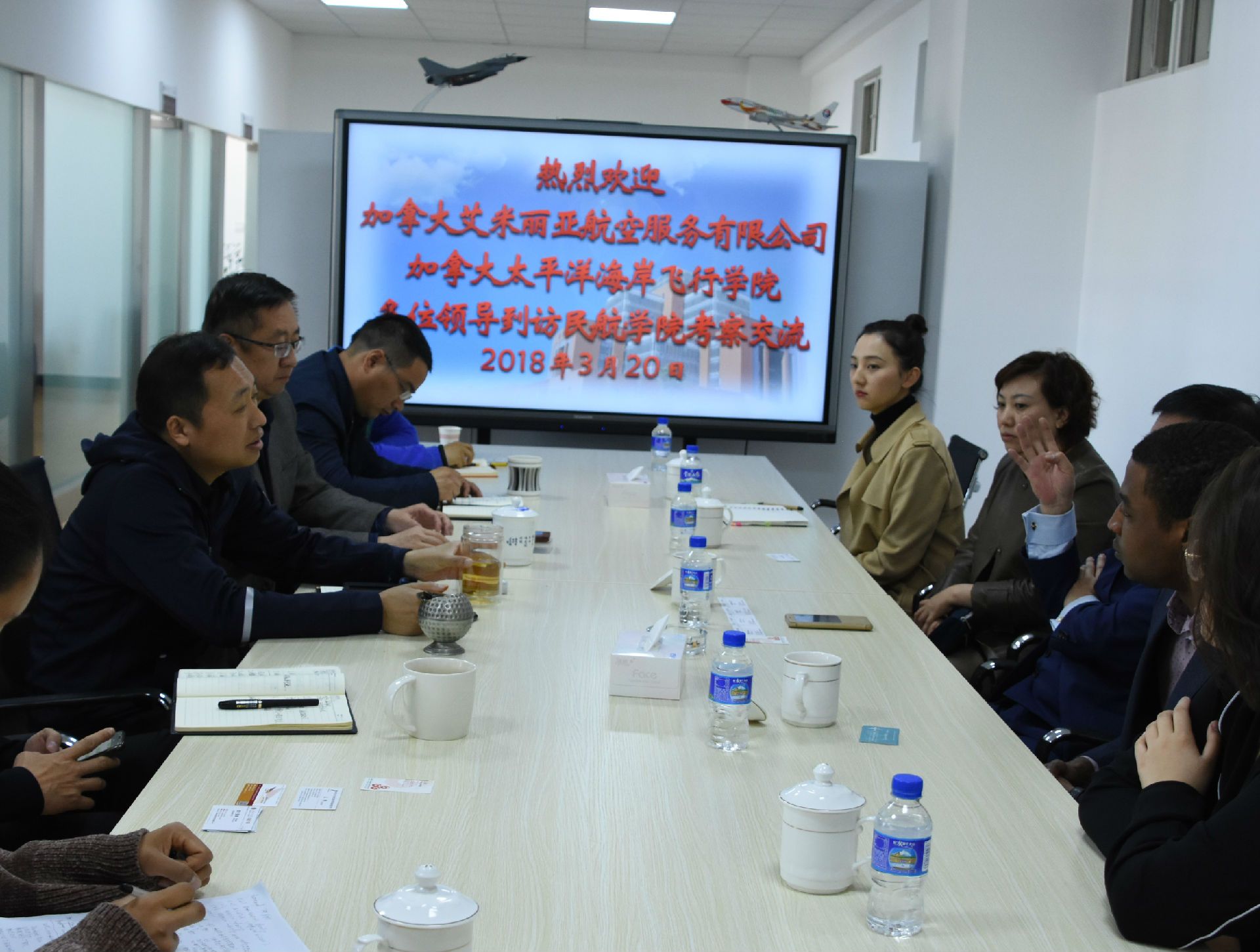 加拿大晶品航空集团有限公司姜宁董事长,加拿大艾米利亚航空有限公司杨芸总裁一5人到我院交流座谈、洽谈合作,学院赵耕书记、刘增力院长、周业林副书记及院长助理等出席。