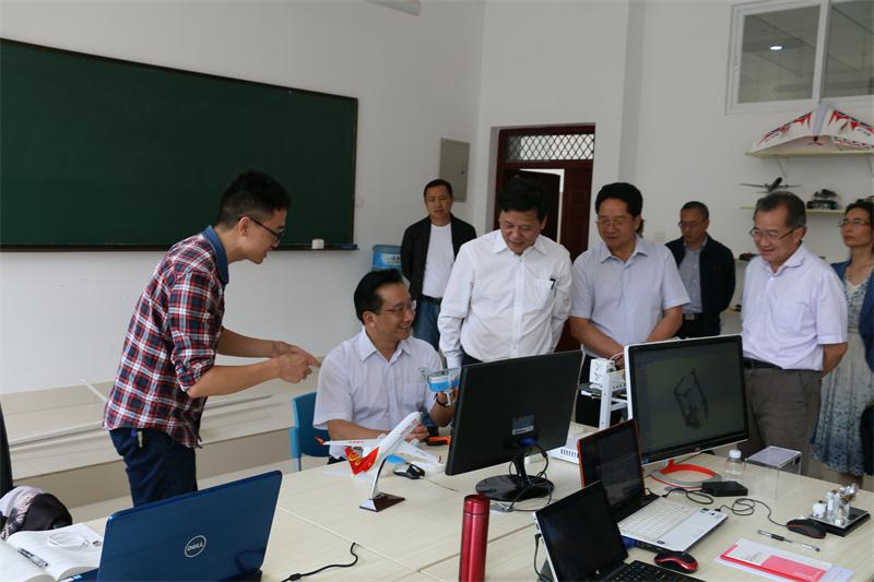 2016年6月24日下午,省人民政府高峰副省长一行,率省级有关部门领导就大学生创新创业到独播库 检查指导工作,并在校党委书记张英杰,副校长王华、易健宏,校纪委书记陶光荣,副校长周峰越、袁希平以及党办、校办等职能部门领导陪同下,到航空学院视察。
