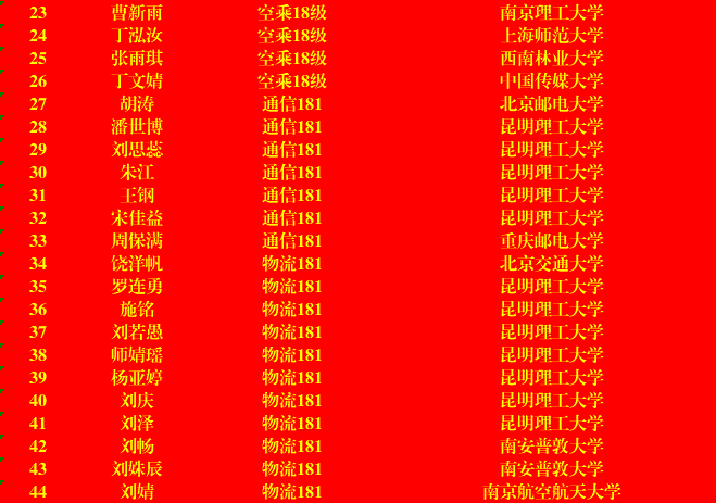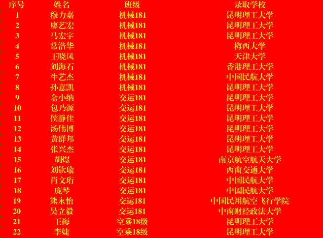 我院2022届共245名本科毕业生,共有44名升学,升学率为17.96%,再创新高,其中物流181班11人,升学率27.5%!其中天津大学,西南交通大学,中国传媒大学,南京航空航天大学等“双一流”高校共9人,占20.93%。