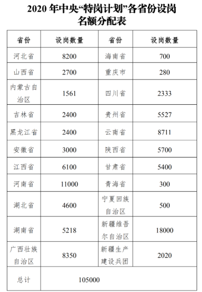 全国招录计划105000人,其中河南省招录人数第一11000人,云南省招录名额排行第二共招8711人(云南省2019年招录共计约6000人),设岗8000以上的省份还有广西(8350人)和河北(8200人)。