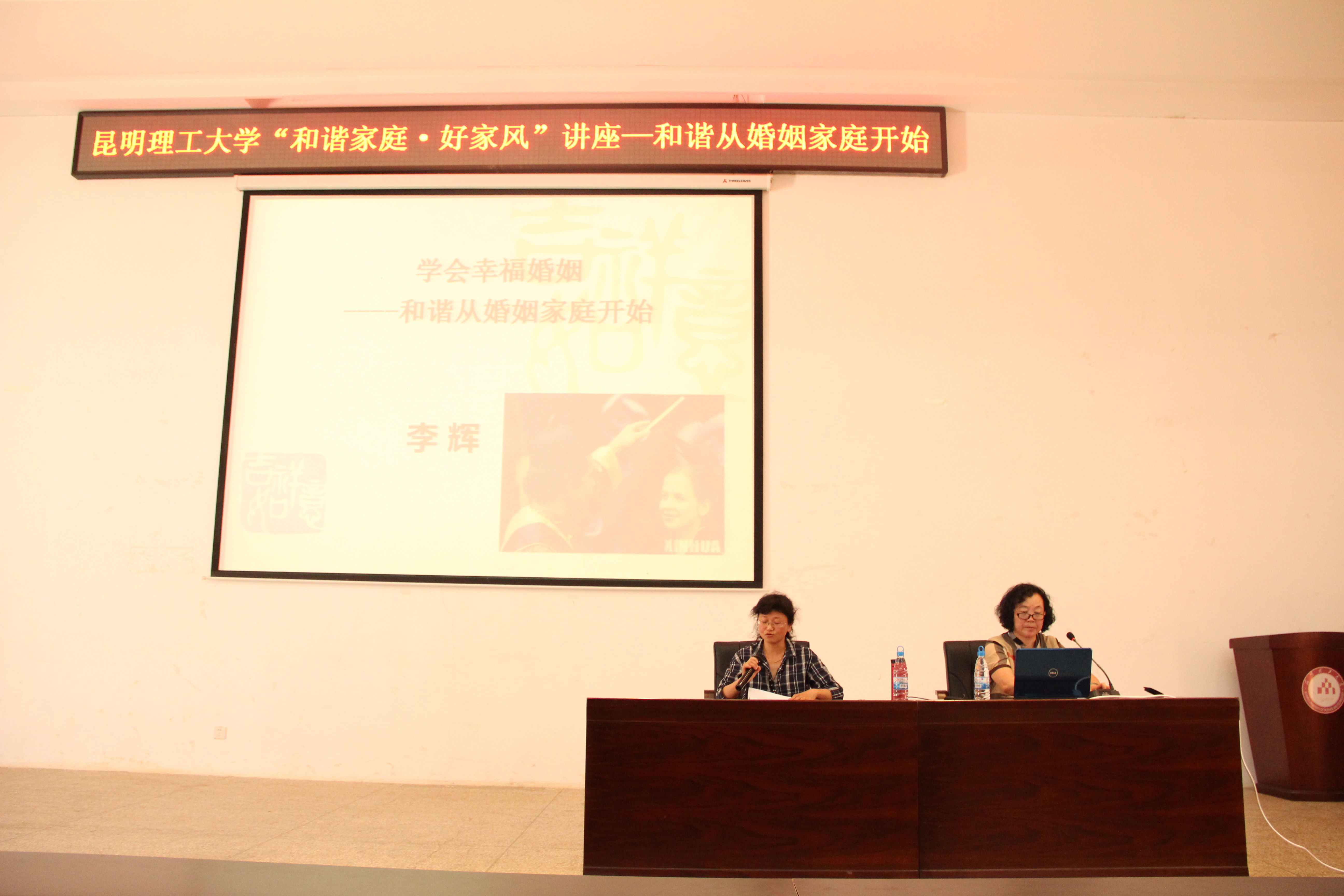 5月12日下午,“和谐家庭·好家风”讲座在机电工程学院小礼堂举行。讲座由校工会常务副主席陈咏梅主持,云南师范大学心理学教授、云南省高等学校教学名师、国家注册心理督导师李辉老师主讲,校女职工委员会成员、校女高知协会理事会成员、各基层工会教职工共100多教职工参加。讲座由校工会主办,机电学院工会承办。